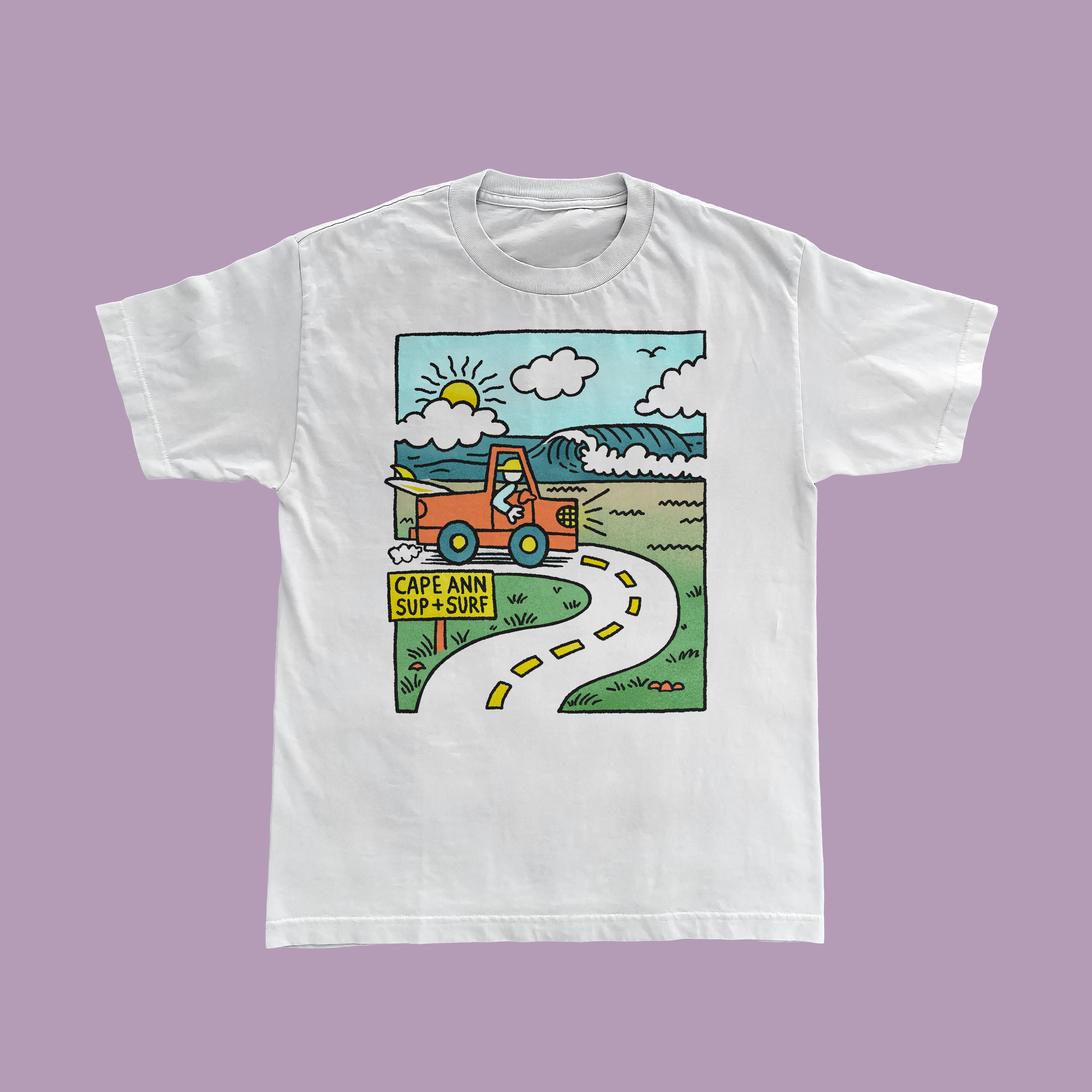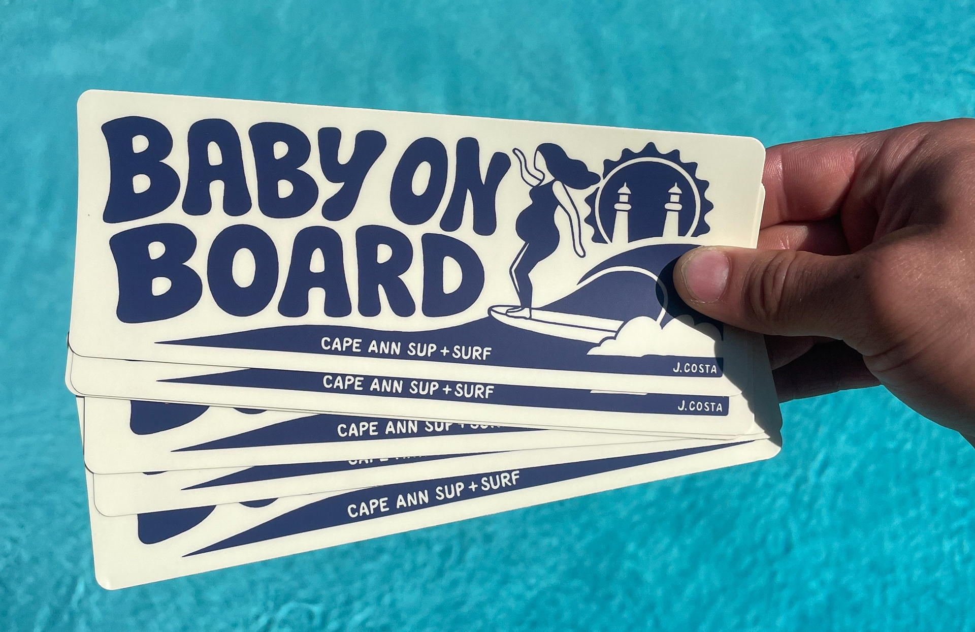 A fun bumper sticker and playful kids' T-shirt design created for Cape Ann SUP + Surf in Essex, Massachusetts.
